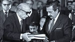 Ernesto Sábato entrega el informe de la CONADEP a Raúl Alfonsín. Foto: Unidiversidad UNCUYO.